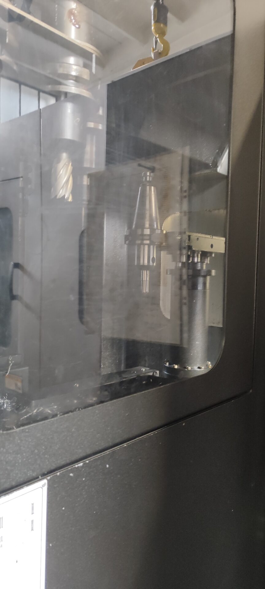 Macchina con basamento monolitico, completa di aria ed acqua attraverso il mandrino, righe ottiche, evacuazione trucioli mediante doppia coclea laterale e trasportatore trasversale.